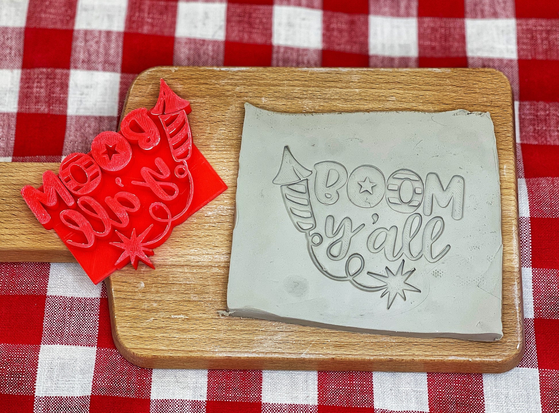BOOM Y'all word design, plastic 3D printed pottery stamp. Measurements are approximate and taken at the widest location. Choose size in drop down menu. For custom sizes not shown, please contact me.