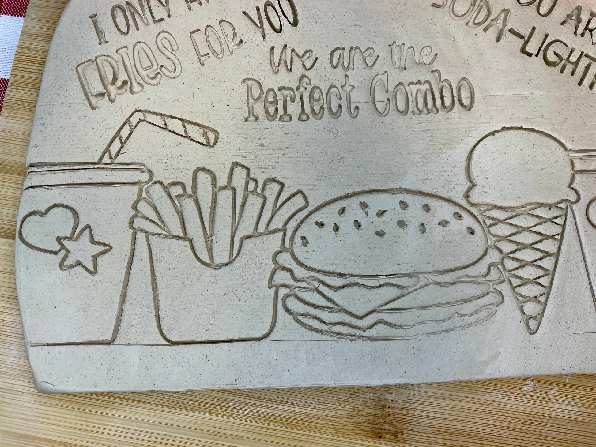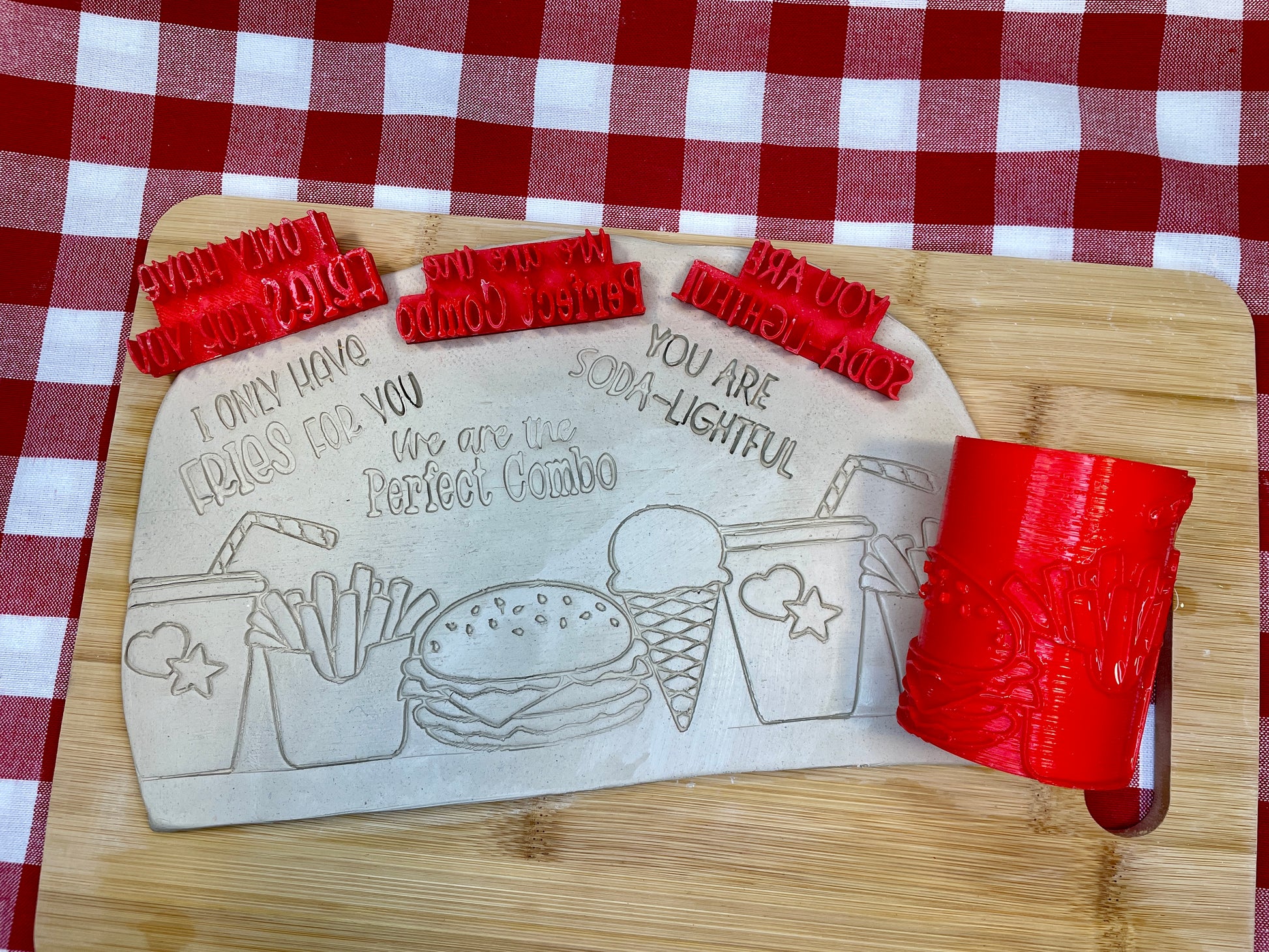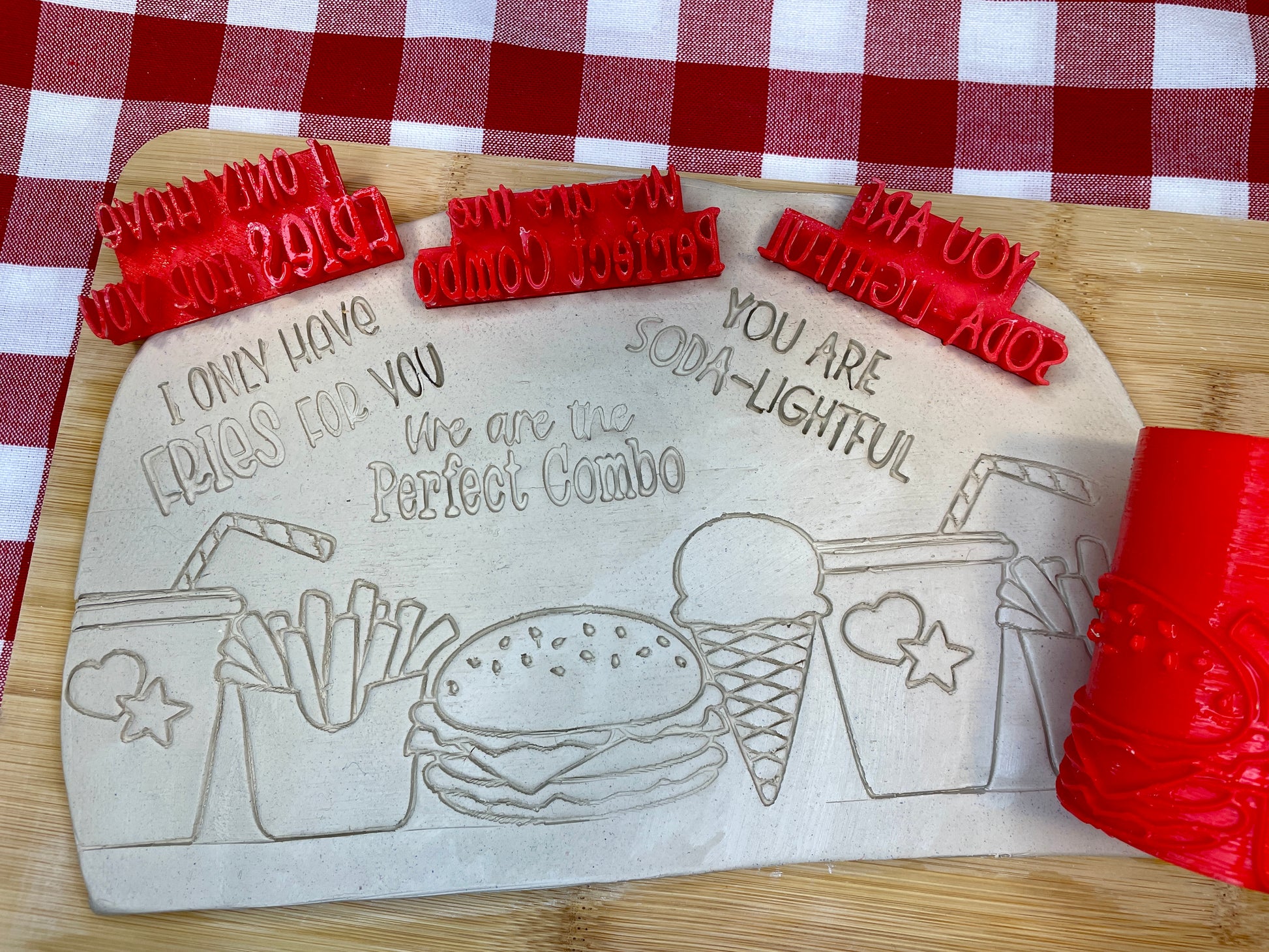 Burger, Fries, Soda, Ice Cream Fast Food Roller, and word stamps: "We are the Perfect Combo", "You Are Soda-Lightful" and "I Only Have Fries For You" - December 2024 Valentines - Punny Food themed Mystery Box