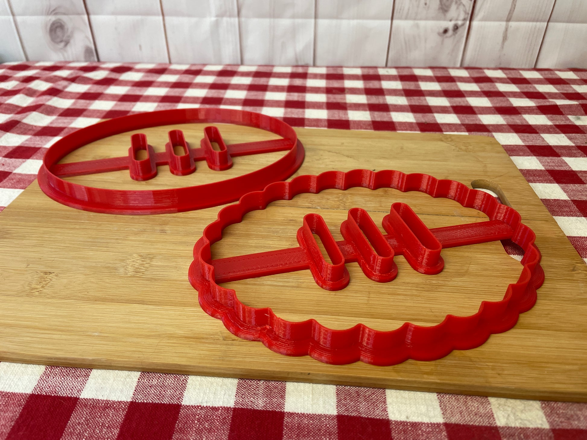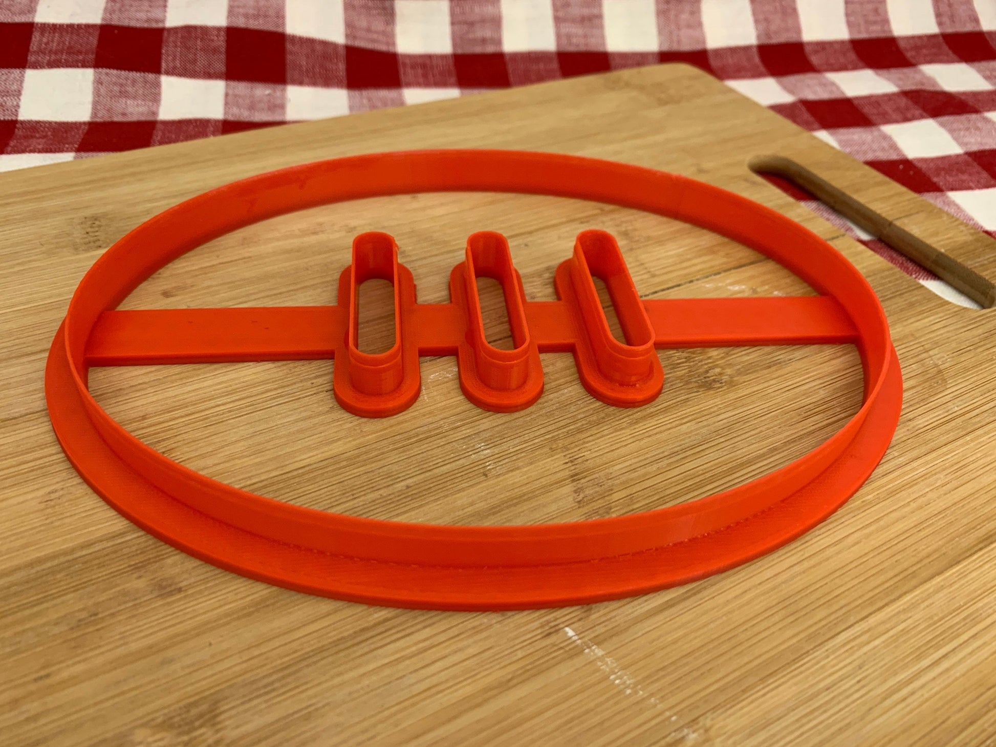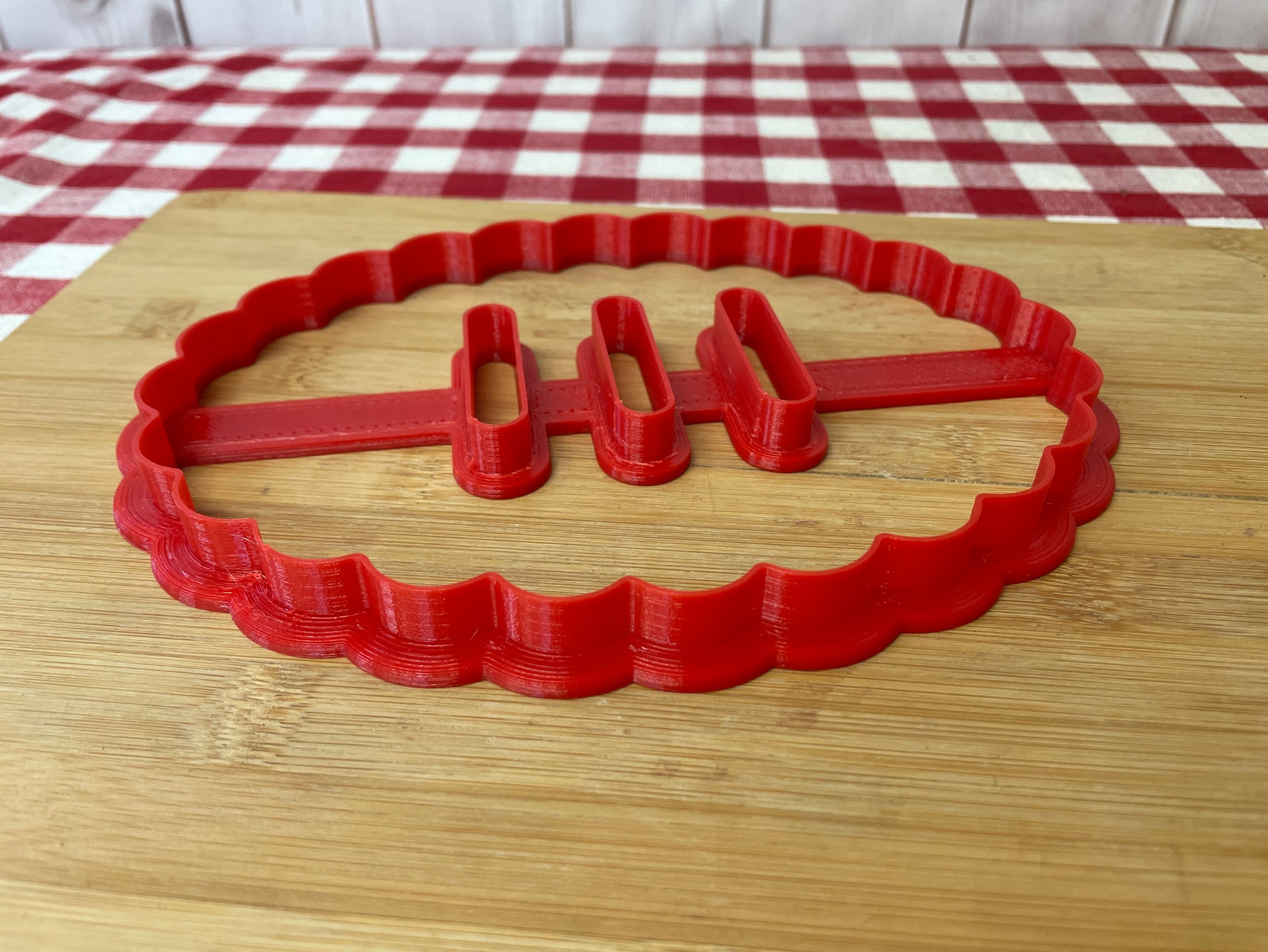Cookie cutter is 3D printed using PLA plastic filament. Keeps its shape as opposed to metal cookie cutters. Has a wide handle for strength and durability.