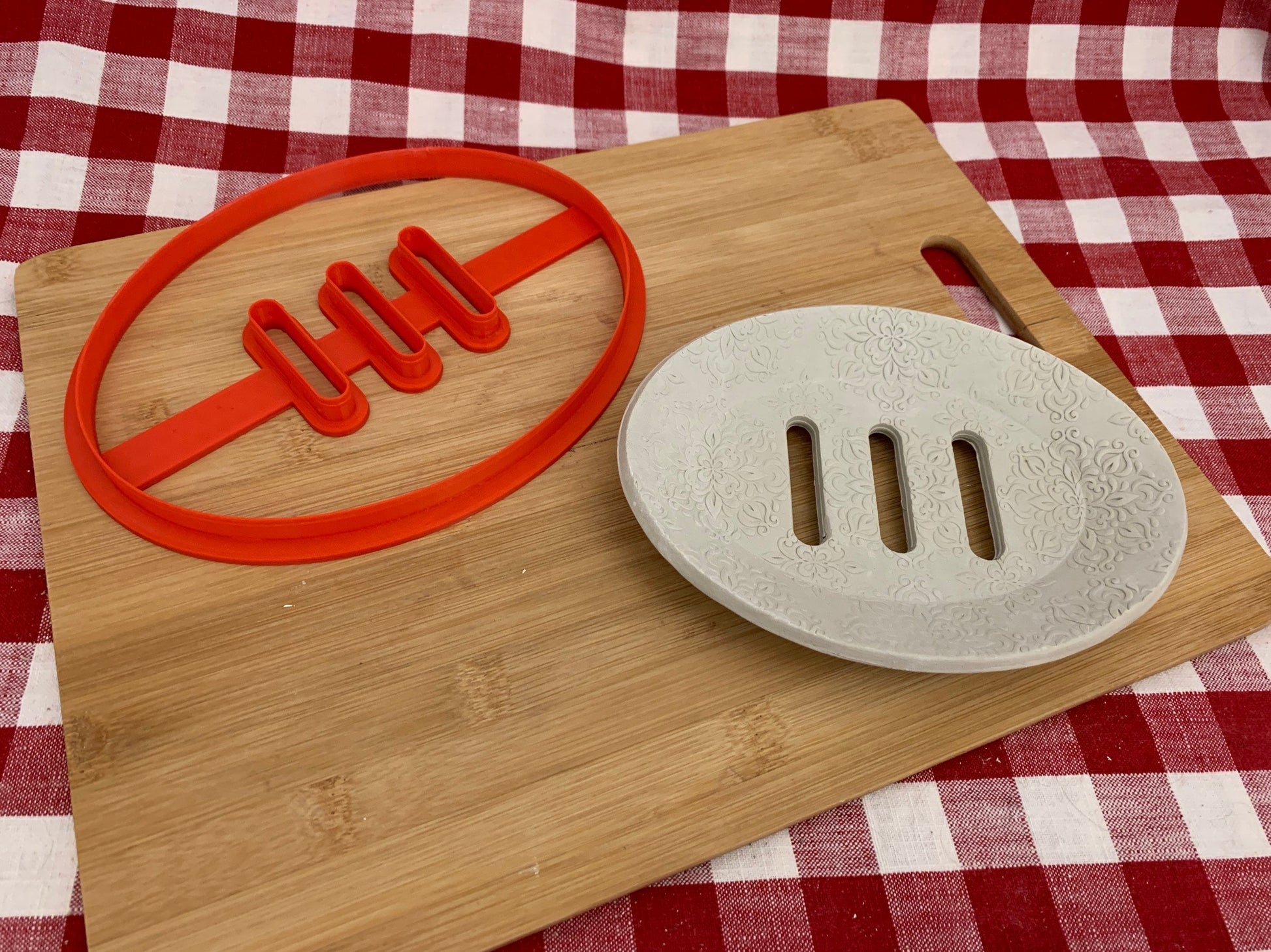 Soap dish cookie cutter plain edge is 5.75" x 7.75". Scallop edge is 6" x 8". With 3 slots for drain holes. Fits GRPottery forms 5" x 7" oval form. Form not included. No hole cutters work well to form a matching dish to fit under the soap dish and use the same GRPottery form.