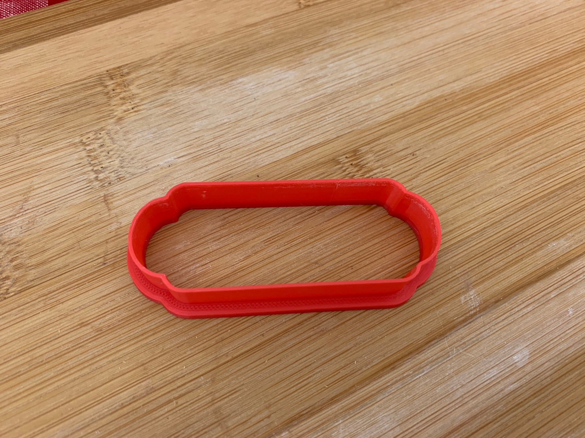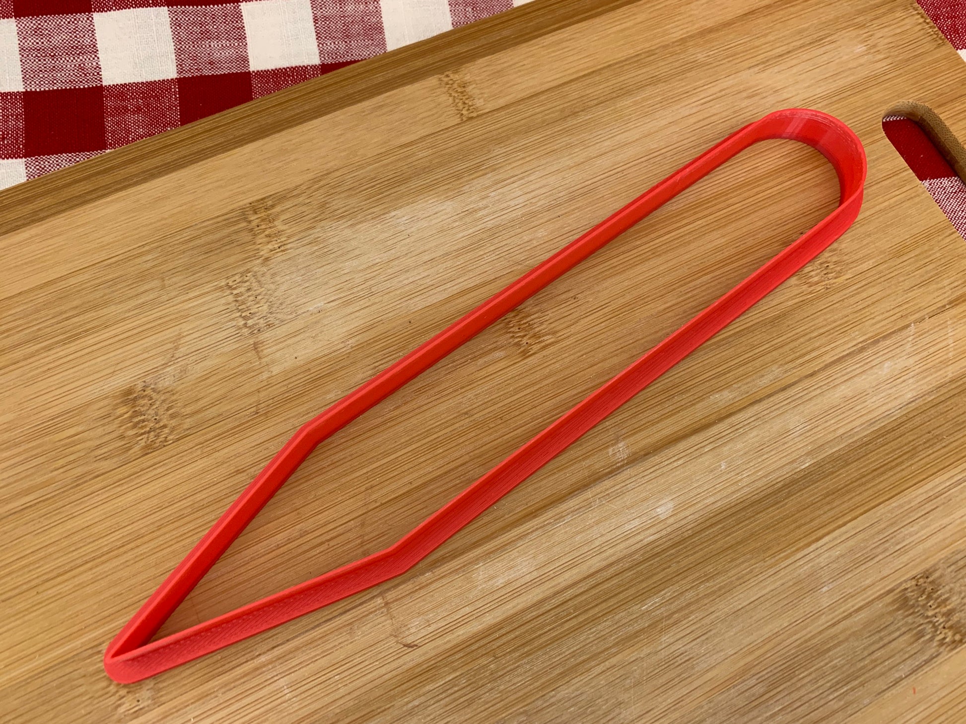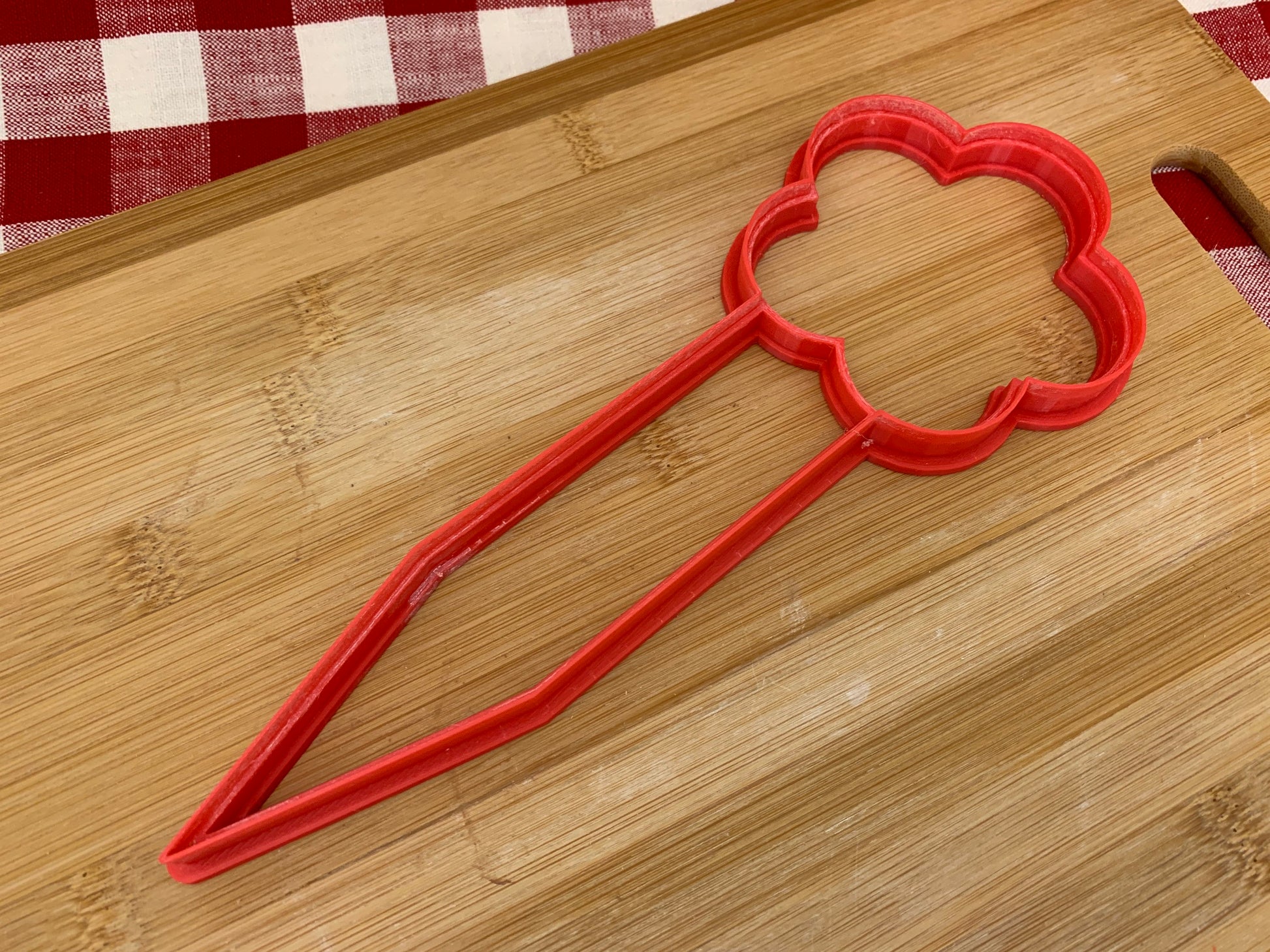 Cookie cutter is 3D printed using PLA plastic filament. Keeps its shape as opposed to metal cookie cutters. Has a wide handle for strength and durability.
