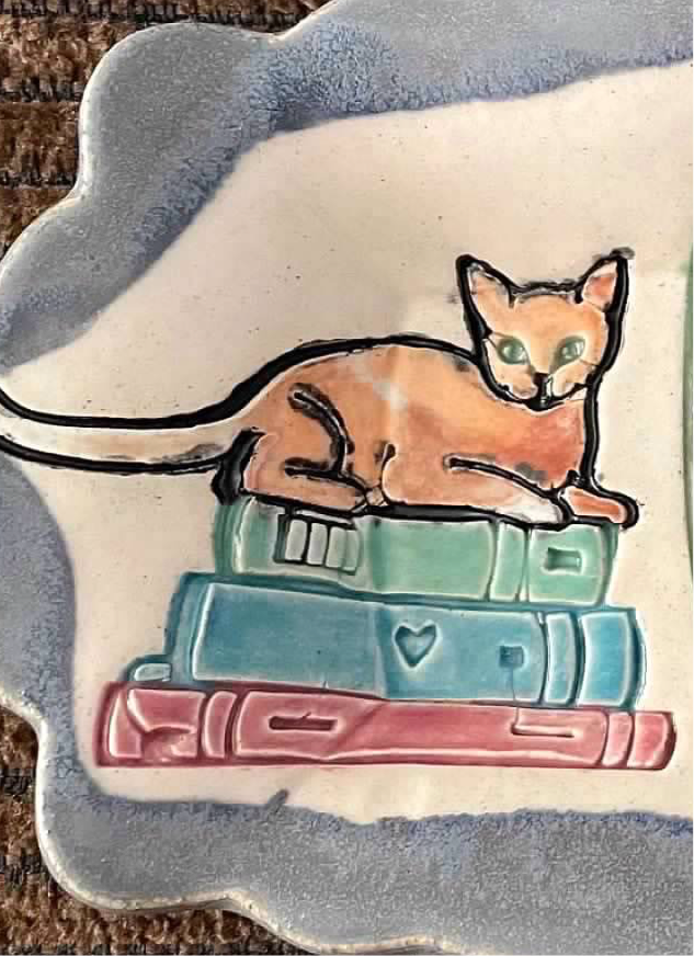 Stack of Books with Cat design from the August 2023 mystery box, Cozy Up With A Book. 3.5" size was in the deluxe box.