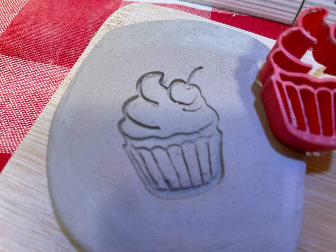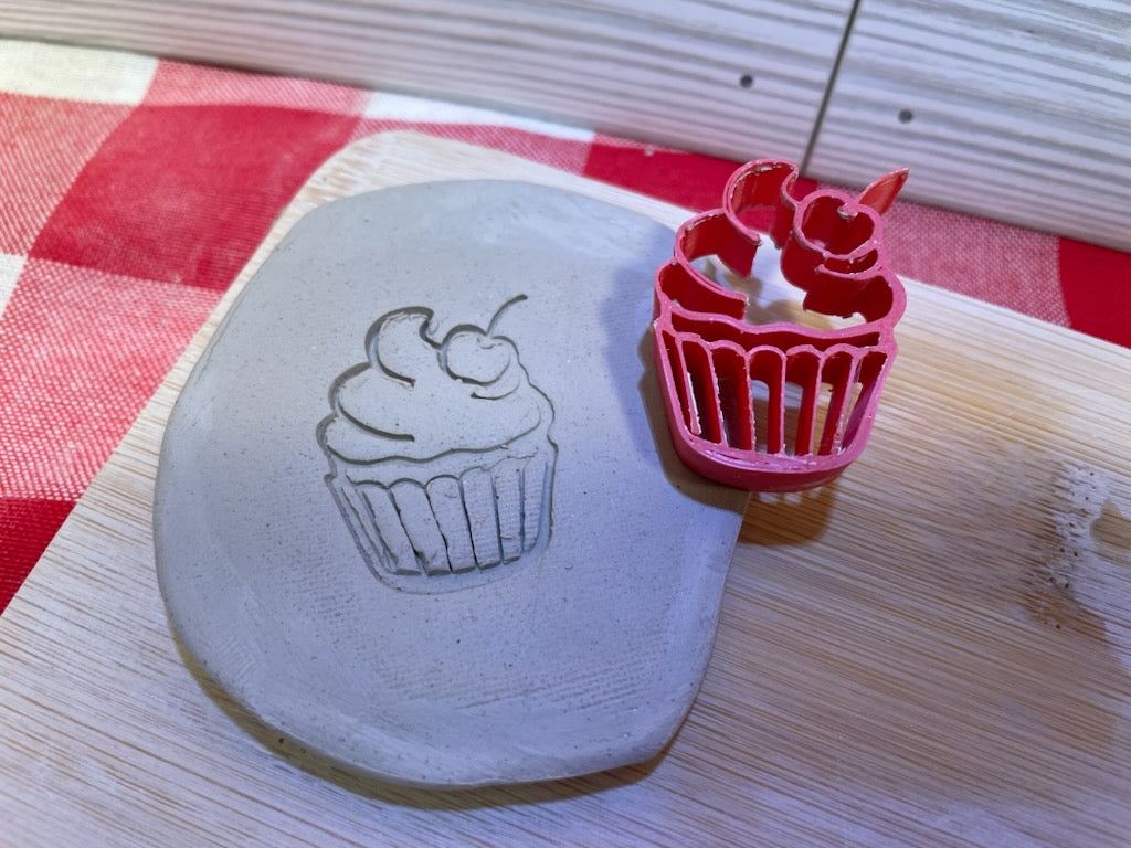 Cupcake pottery stamp that was part of the December 2023 mystery box, country kitchen themed. 1.5" size was part of the basic, deluxe, and premium box.