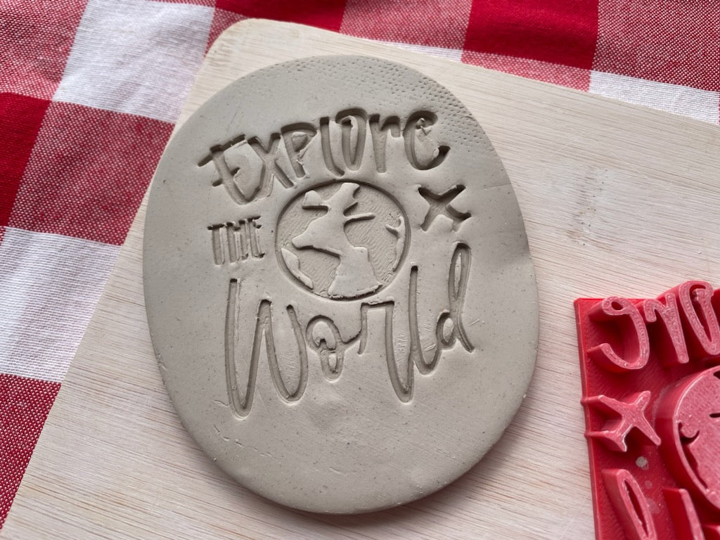 "Explore the World" word pottery stamp, from the March 2024 Travel mystery box - multiple sizes available, 3D printed