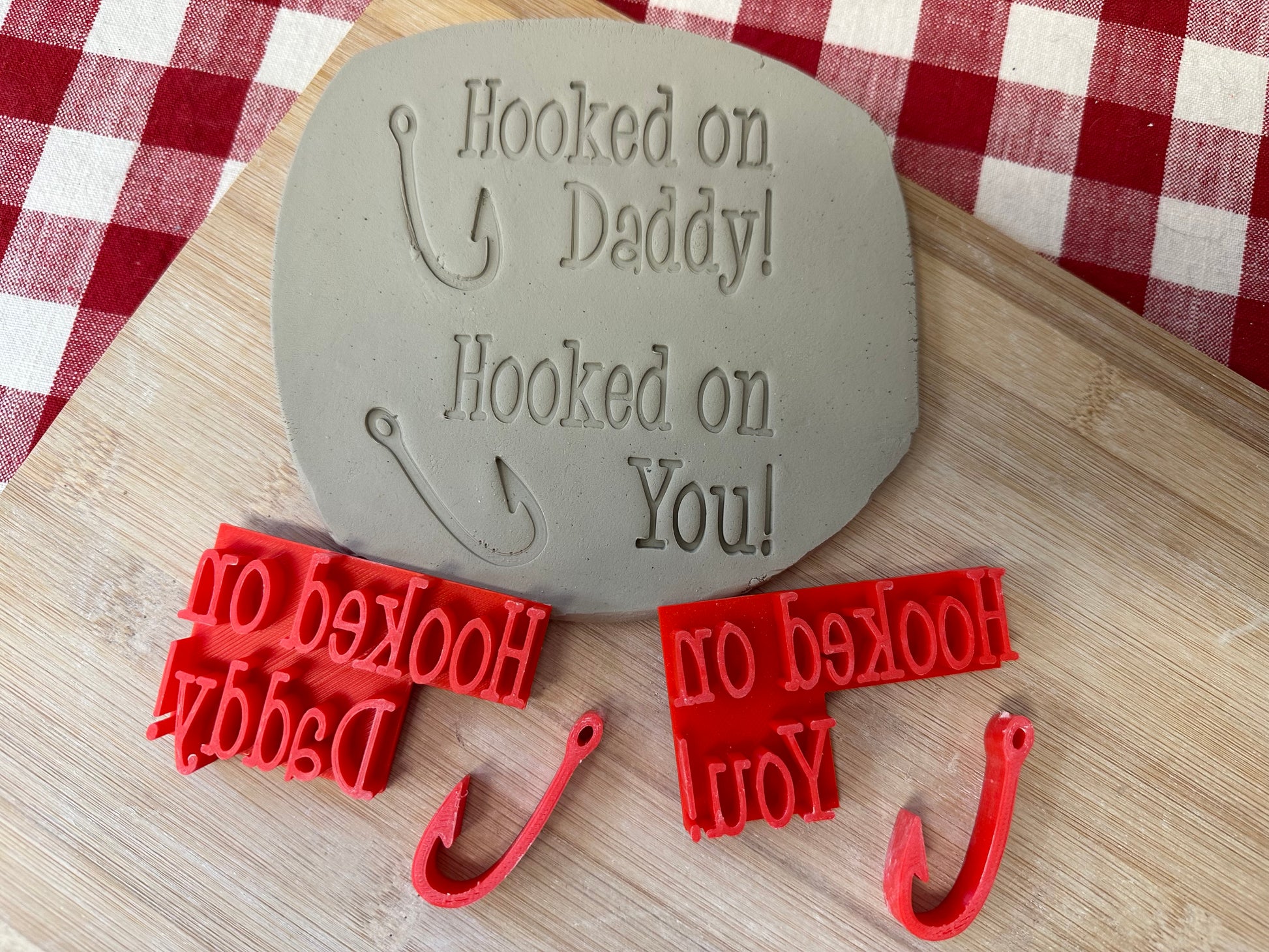"Hooked on You!" or "Hooked on Daddy!" word stamp w/fish hook -pottery, plastic 3D printed, multiple sizes available
