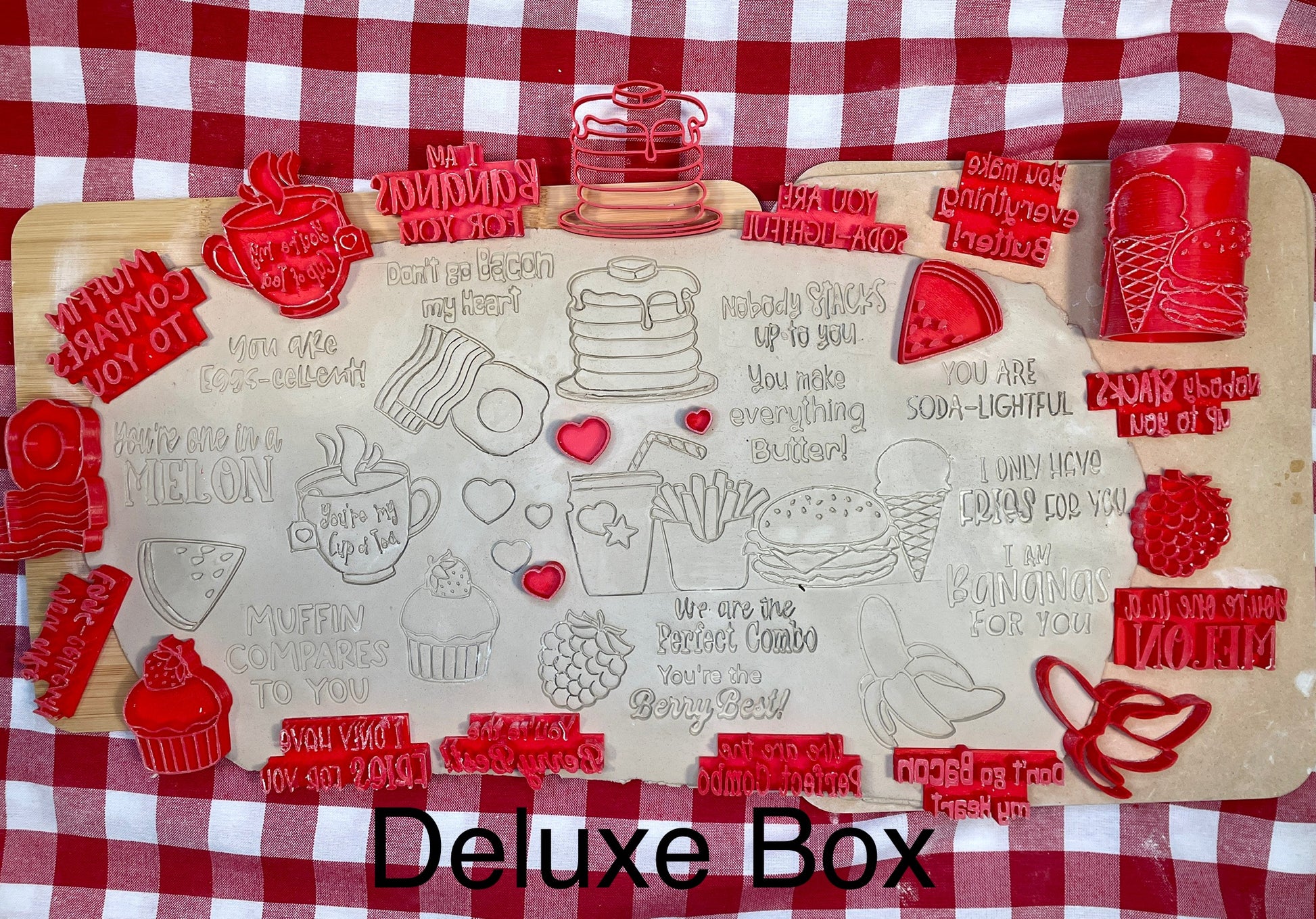 This is a monthly mystery box for December 2024. Boxes will ship out as soon as they become ready. Current boxes are all new, never released items. See my Instagram or Facebook page for sneak peeks. This months box is Valentines themed, but not your typical Valentines! These are punny food stamps and words, perfect for year round. There are 10 stamps in the basic box and 1 roller and a total of 21 stamps in the deluxe box. The Deluxe box contains everything in the basic box.