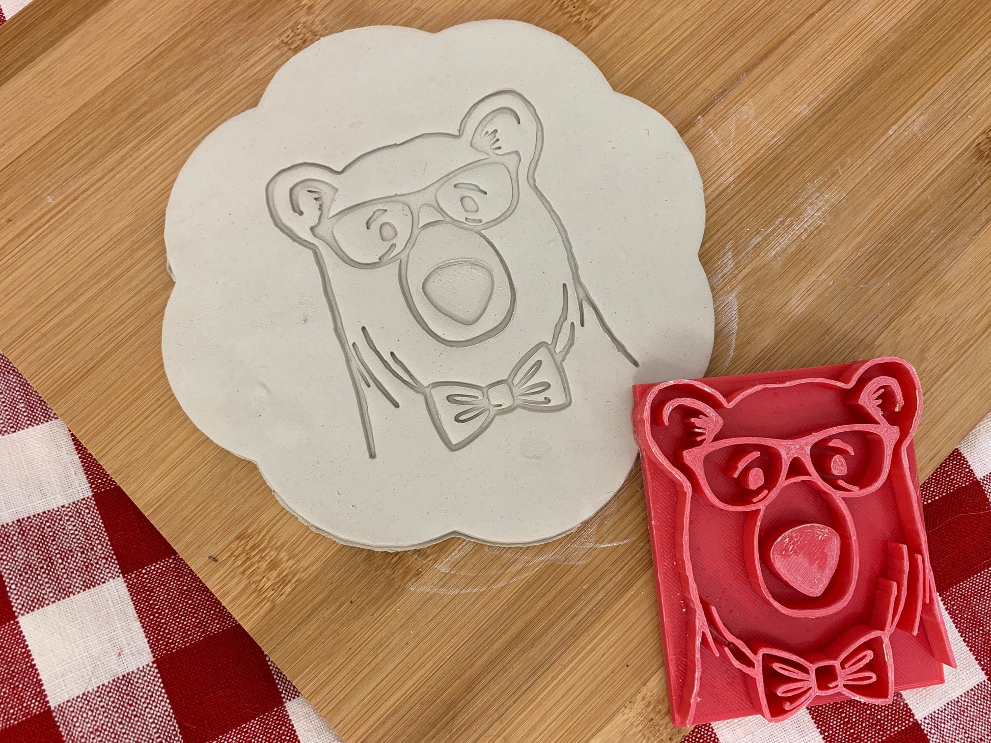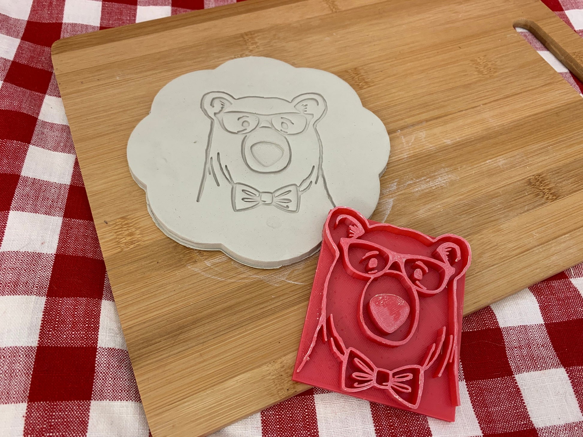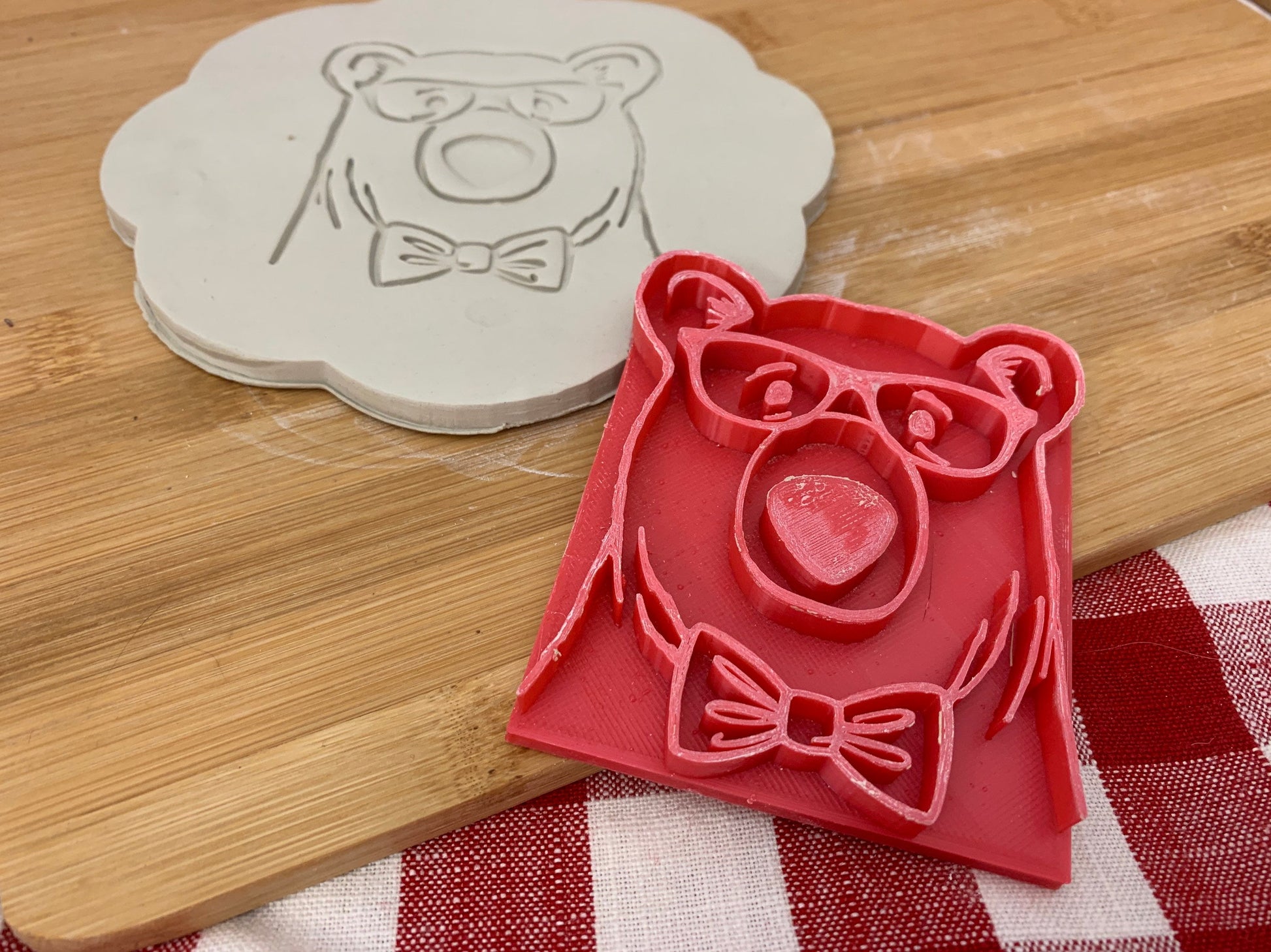 Bear Face w/ glasses or floral wreath pottery stamp - plastic 3d printed, multiple sizes