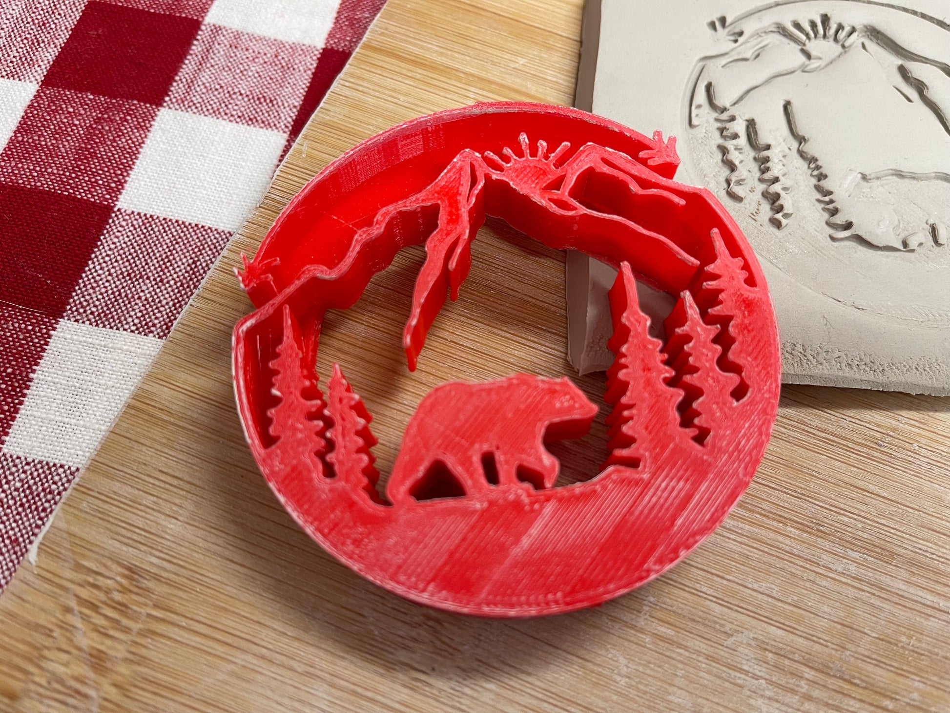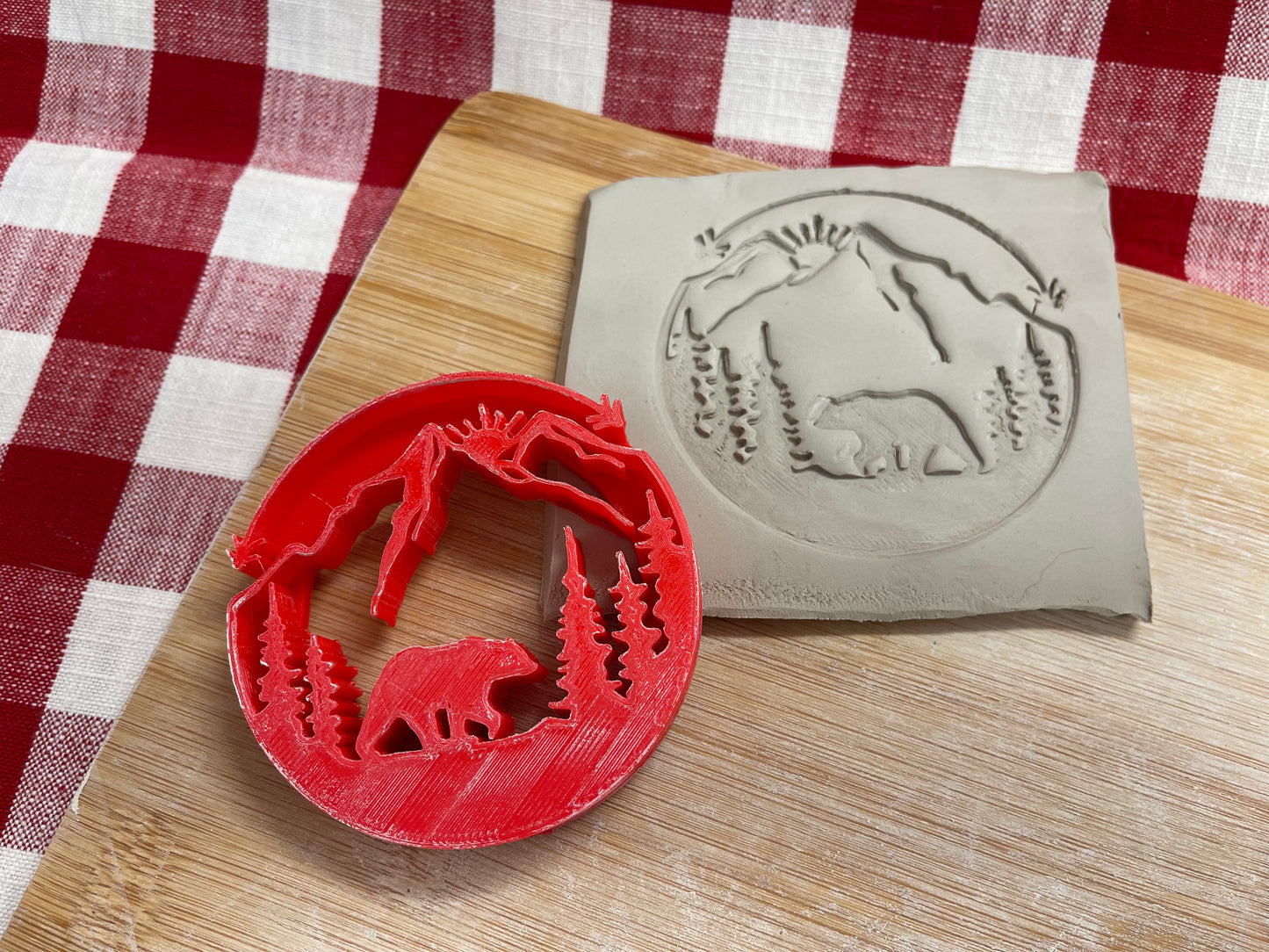 Bear in the mountains scene pottery stamp - plastic 3d printed, multiple sizes available