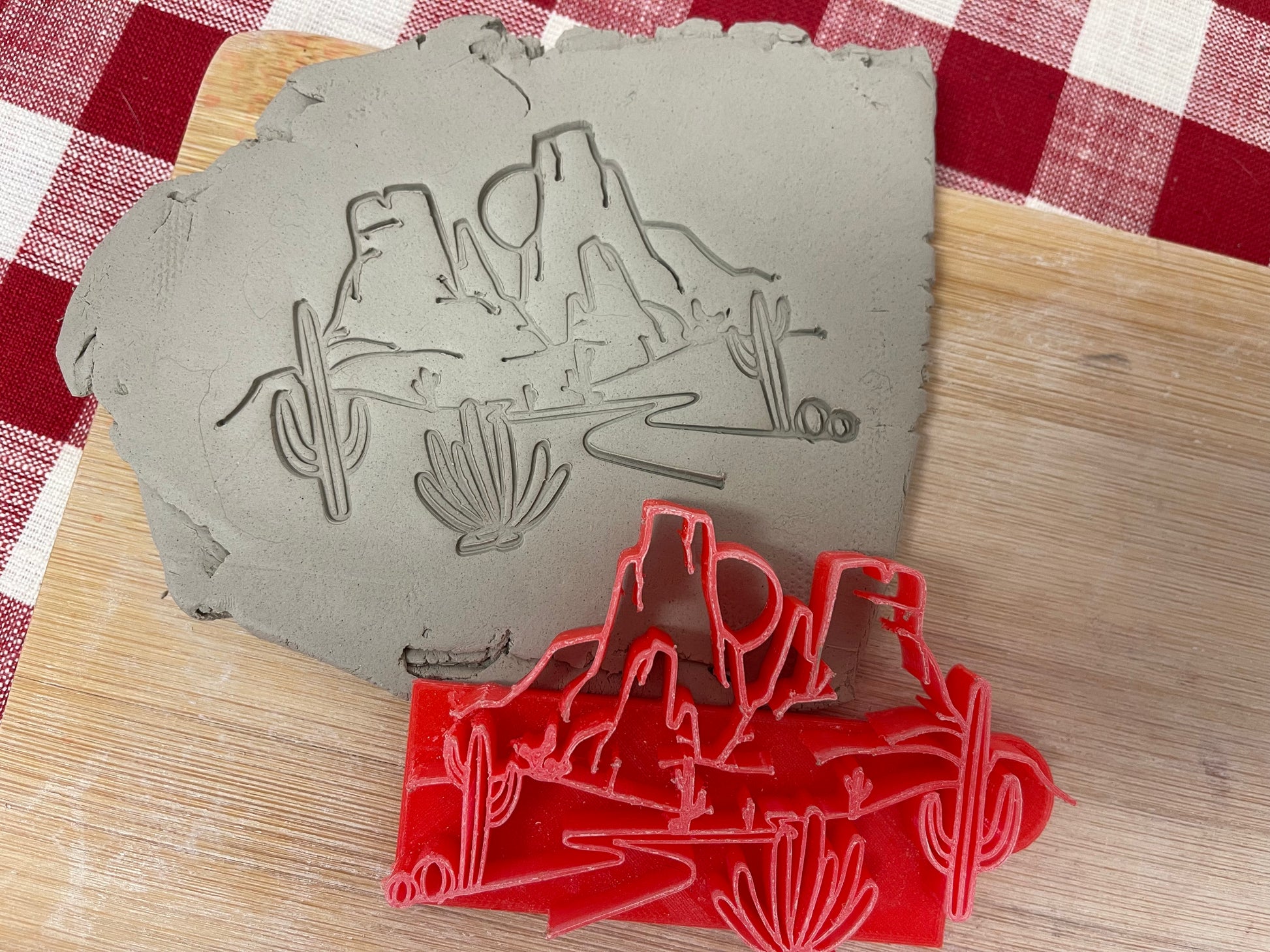 Pottery Stamp, Desert canyon scene design, from the March 2023 mystery box, plastic 3d printed, multiple sizes available