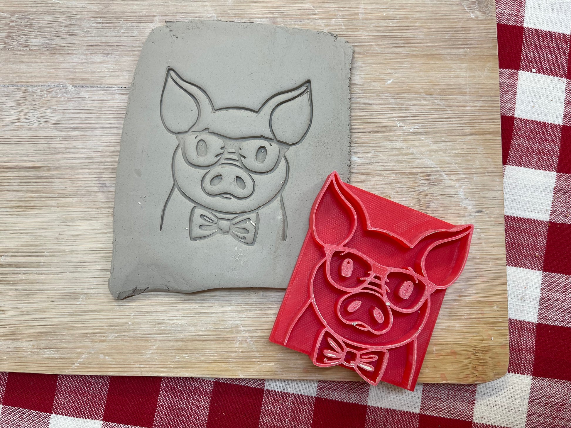 Pig Face w/ Bowtie and Glasses Pottery Stamp - Pottery Tool, plastic 3d printed, multiple sizes available