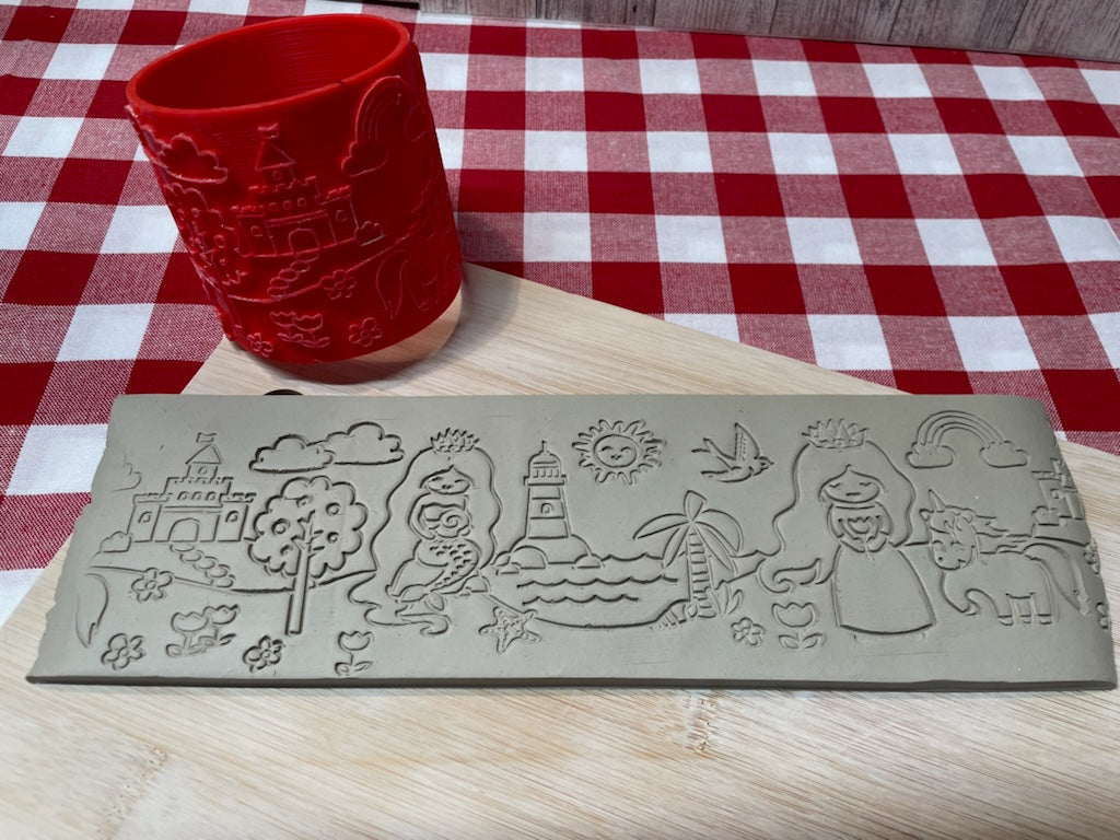 New size: 3" tall x 3" diameter. 10.5" repeating pattern. Roller was included in the May 2024 deluxe mystery box, Girls themed. Plastic roller for pottery use, imprints a border design.