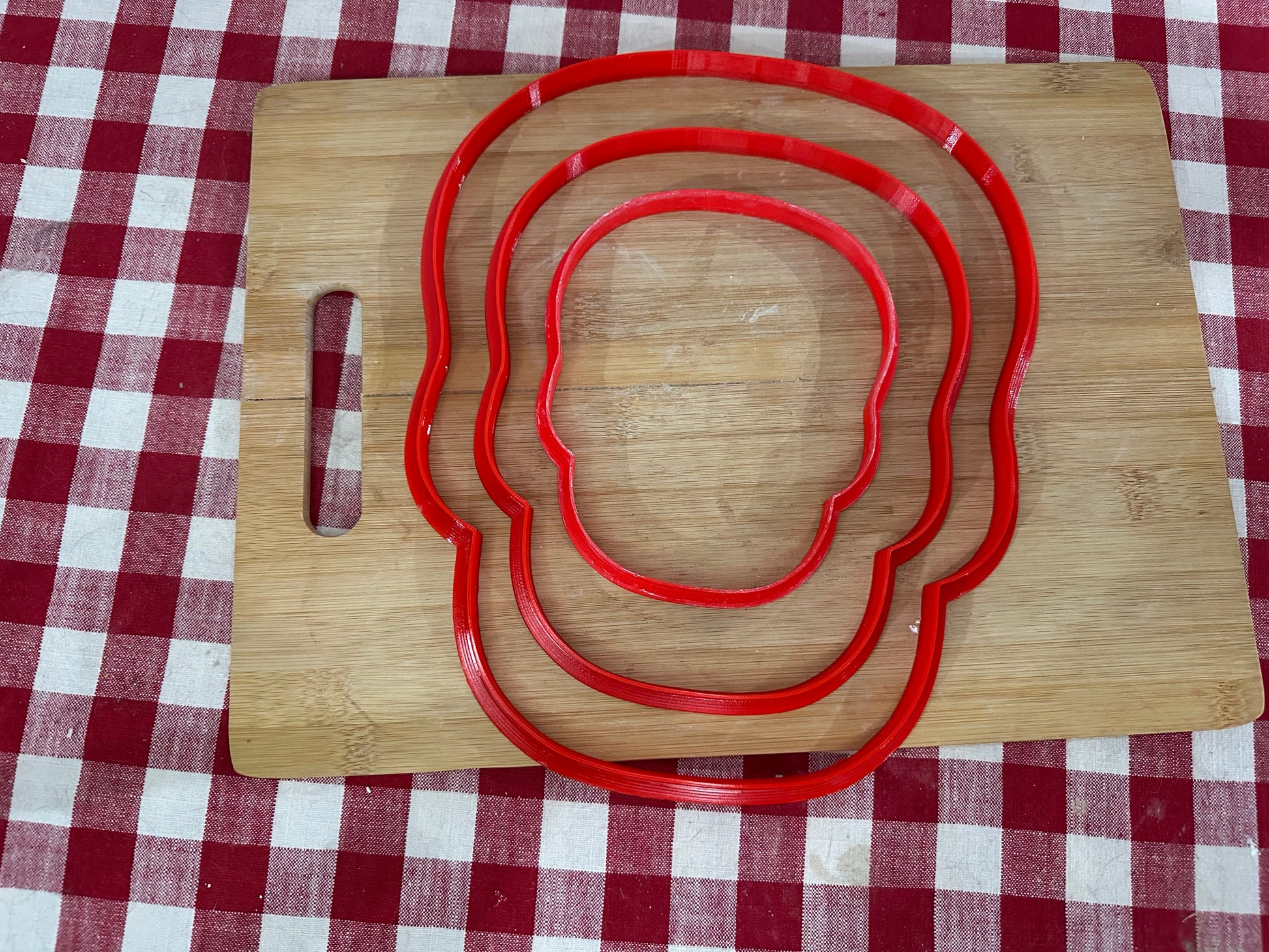 Cookie cutter is 3D printed using PETG plastic filament. Keeps its shape as opposed to metal cookie cutters. Has a wide handle for strength and durability.