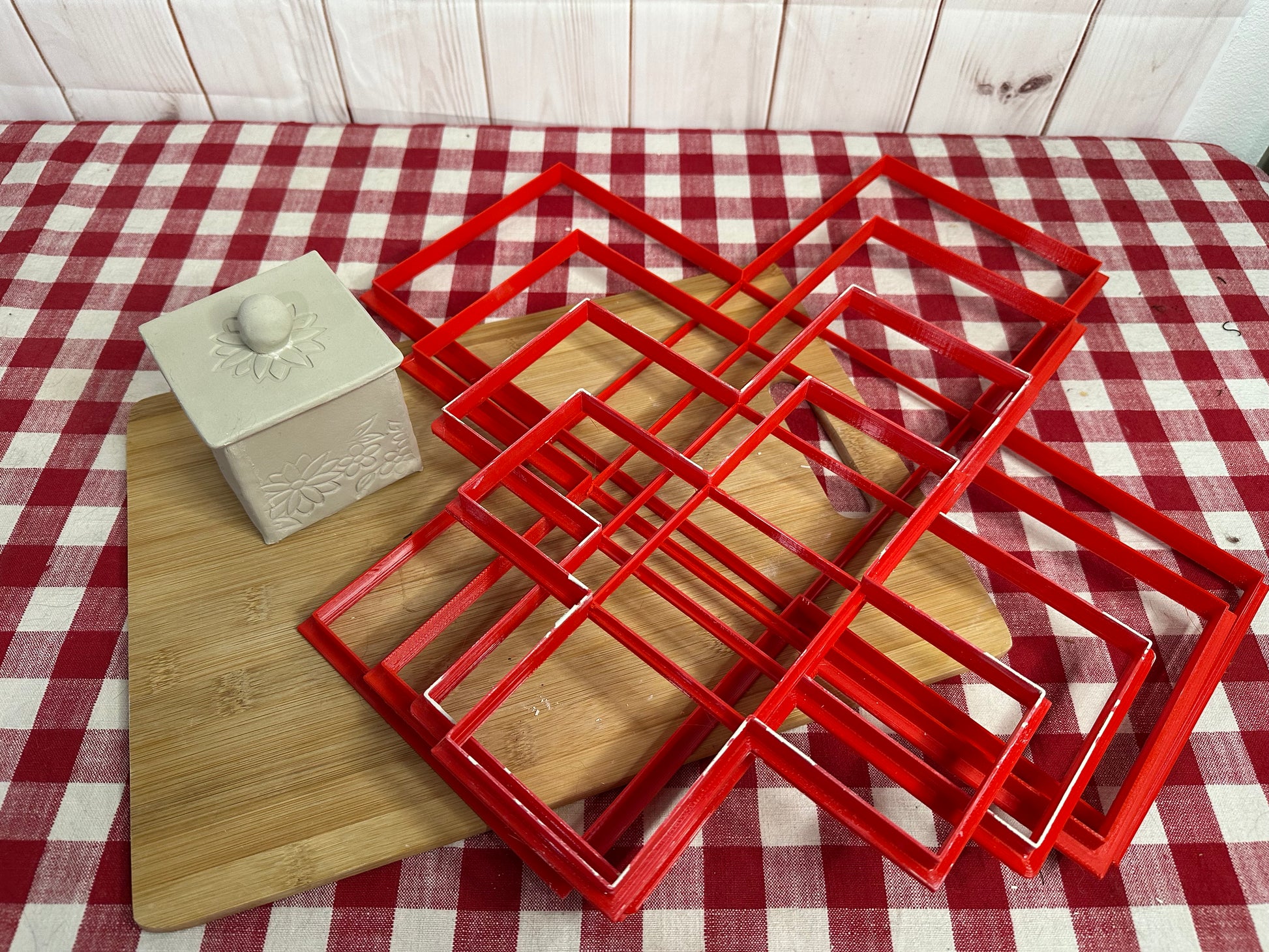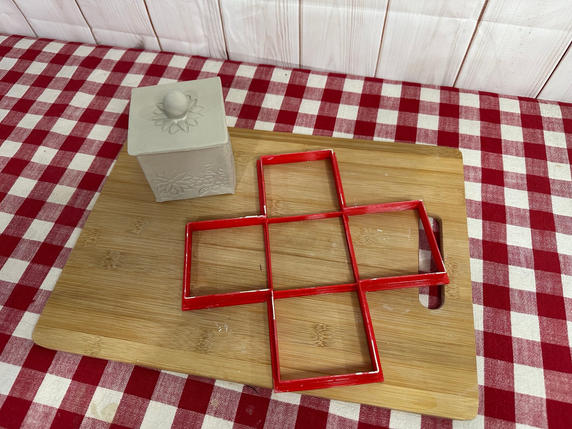 Square Cube Box template cookie cutter perfect for hand built pottery shapes. Dimensions in pull down menu are formed dimensions before firing. Dimensions are approximate and can vary based on clay thickness. Box can be left open, closed up or finished with a lid. For a flat lid, cut a square 1/2" bigger.