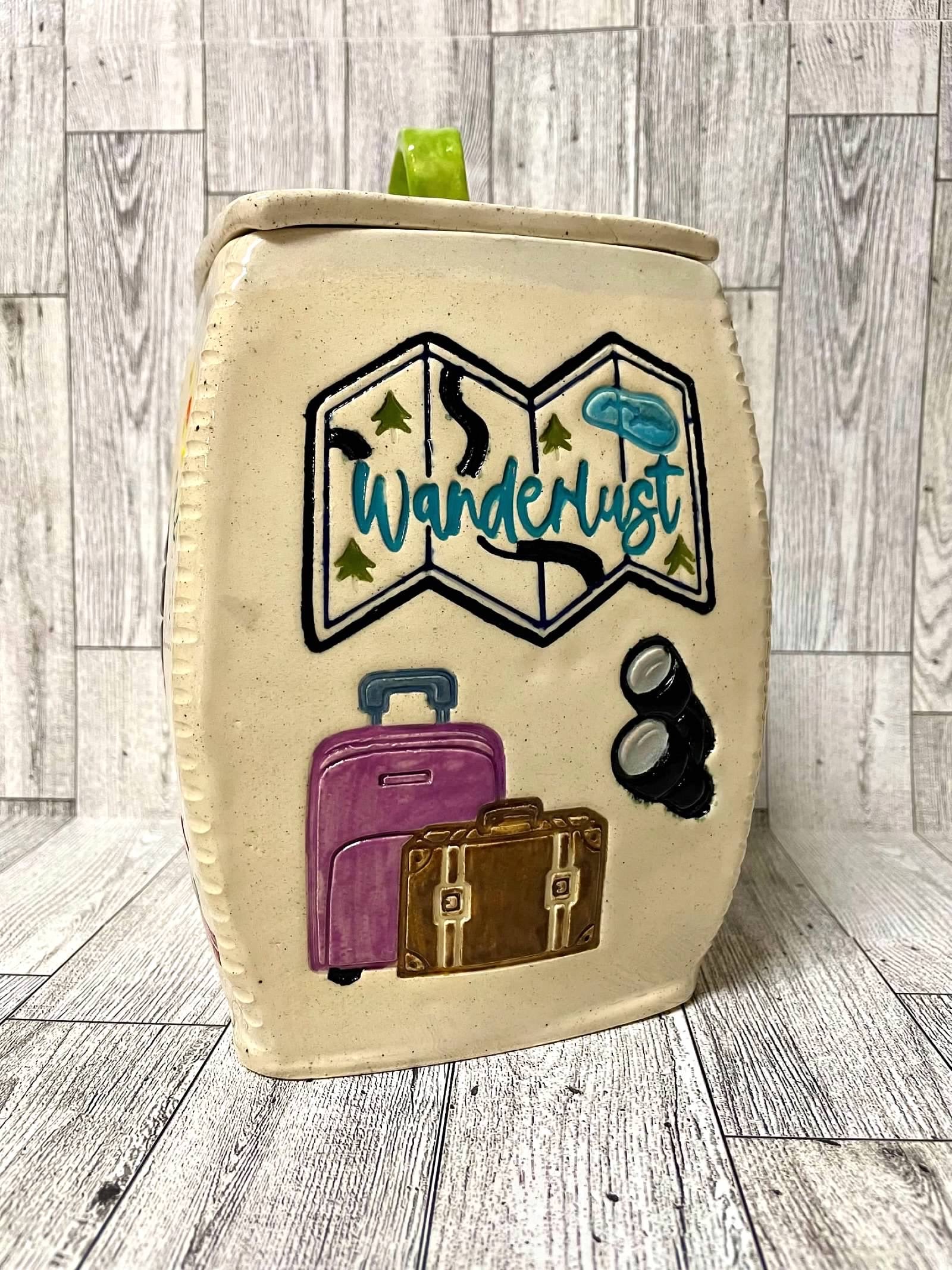 "Wanderlust" with map word pottery stamp, from the March 2024 Travel mystery box, 3d printed, multiple sizes available