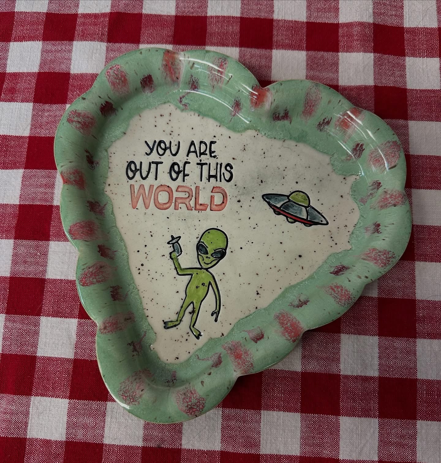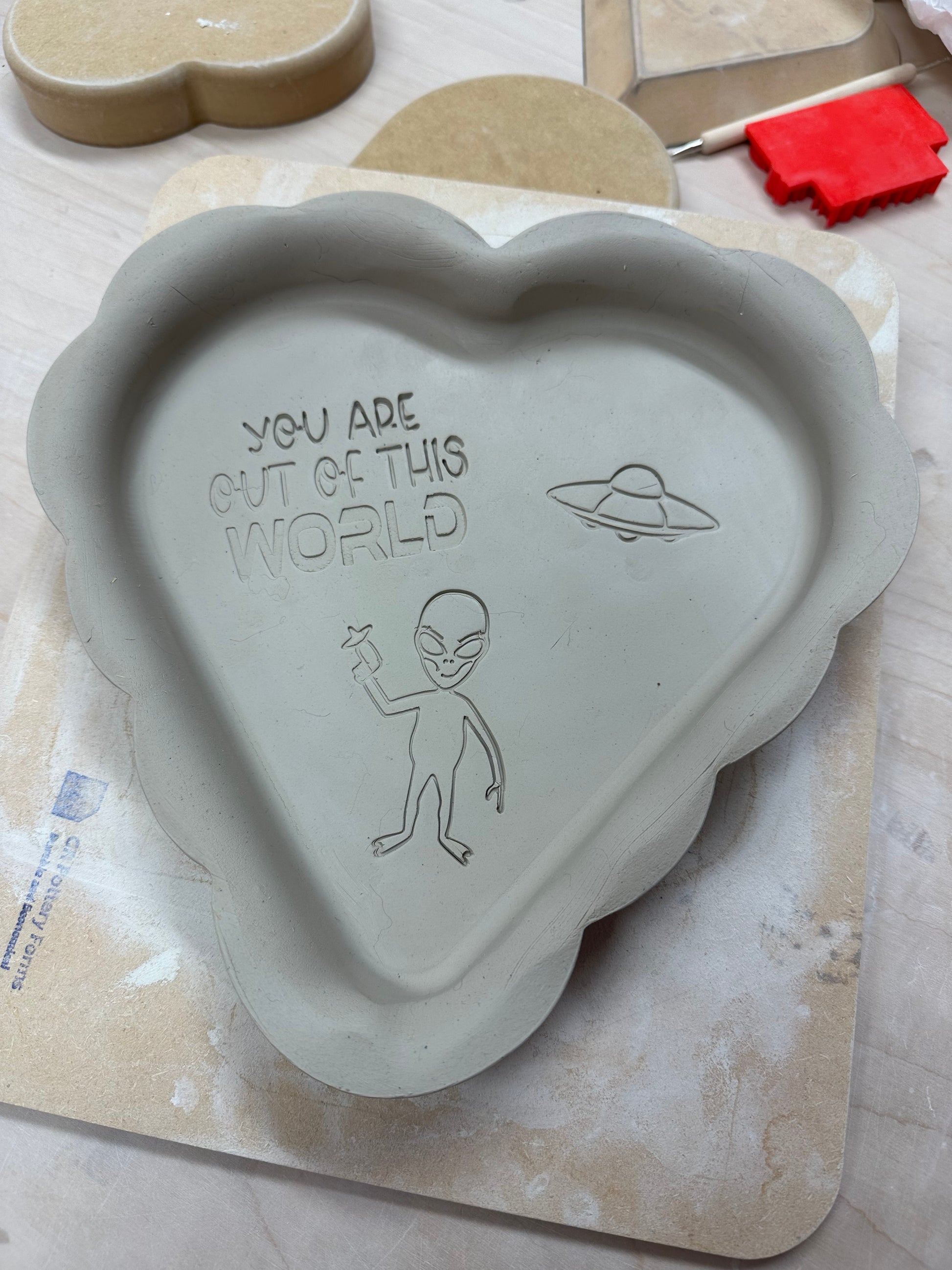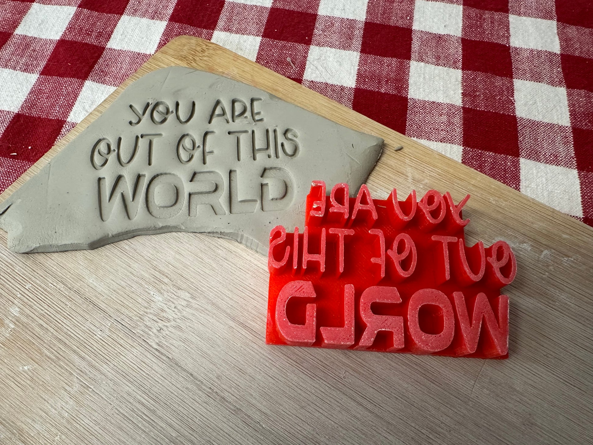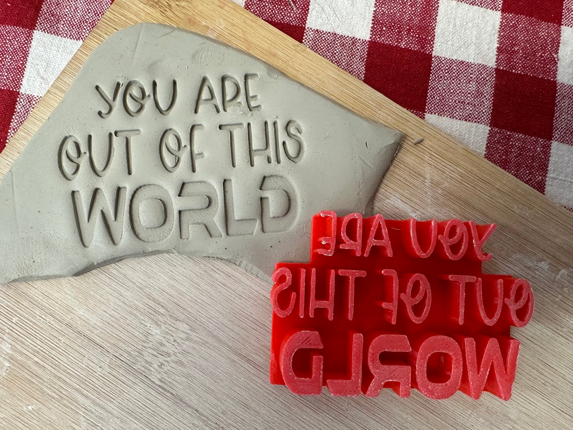 "You are out of this world" word design, plastic 3D printed pottery stamp. Measurements are taken at the biggest location. Choose size in drop down menu. For custom sizes not shown, please contact me.